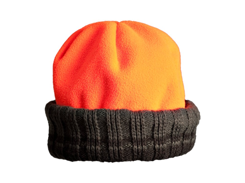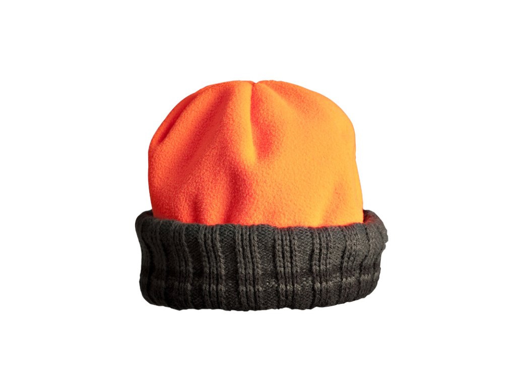 Obojstranná pletená čiapka Polarfleece, v zelenej a oranžovej farbe pre lov zveri za chladného počasia. Zelená strana čiapky je pletená a oranžová Fleeace.