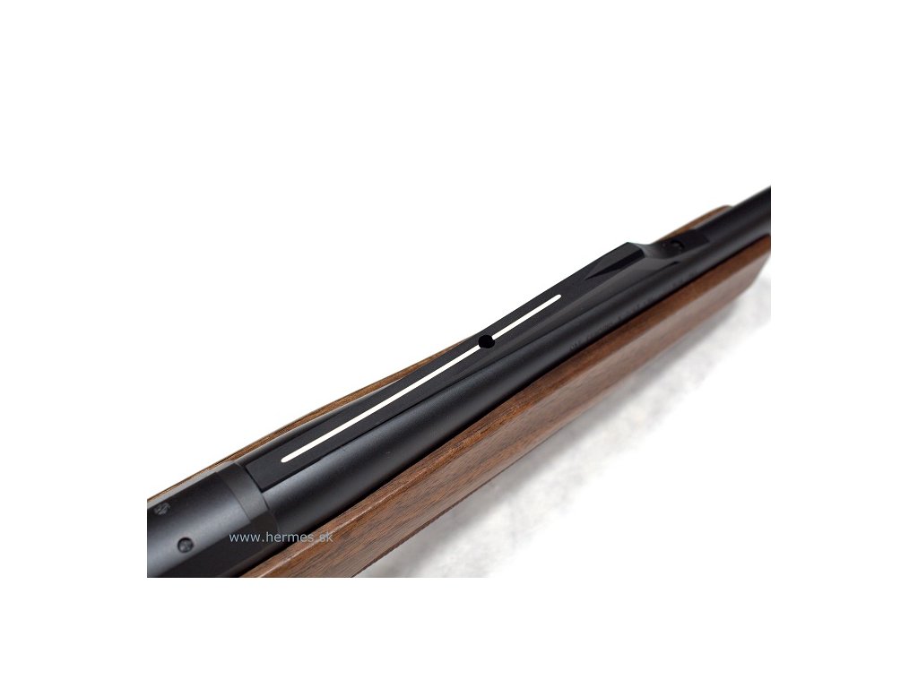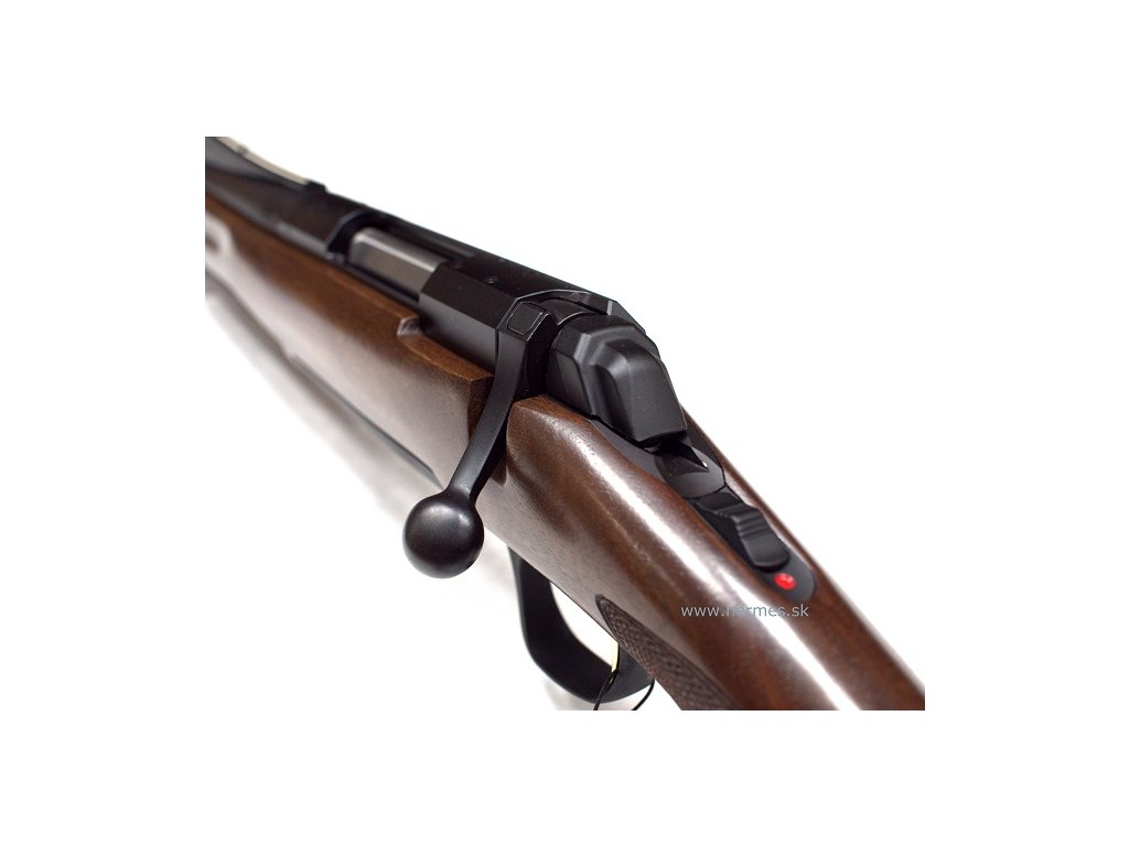 Drevená orechová pažba s ergonomickým tvarovaním pre ľaváka zabezpečuje pohodlné mierenie aj pri montovanej optike. Super Feather Trigger poskytuje ostrý, čistý chod bez zbytočného odporu a prispieva k presnosti výstrelov.