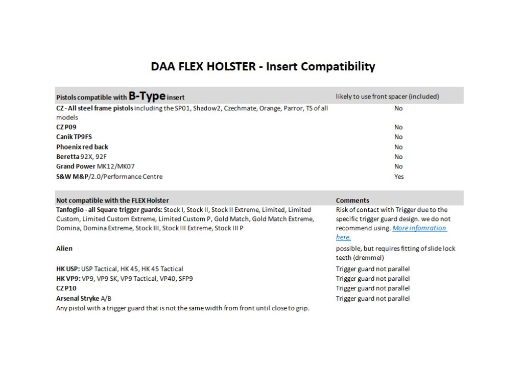 Krása vložky Flex spočíva v tom, že aj keď sme váš model pištole nikdy neskúšali a nie je na našom zozname - je viac ako pravdepodobné, že sa dá použiť s blokom typu A alebo B! Ak chcete určiť, ktorý z nich potrebujete pre model pištole, ktorý nie je uvedený v zozname, stiahnite si a vytlačte náčrt pištoľového uloženia a postupujte podľa pokynov v inštalačnom videu, ako ho použiť na určenie toho, ktorý blok vložky možno použiť s VAŠOU pištoľou. potrebujem zostavu bloku vložky typu A alebo typu B?