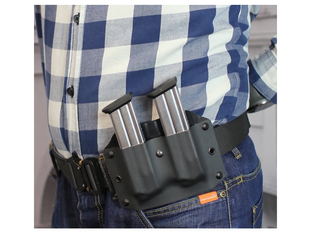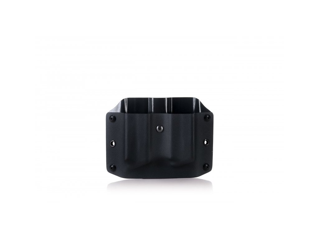 Kydex puzdro na dva zásobníky s opaskovými prevliečkami z tvrdeného plastu. Tasenie a zapuzdrenie zásobníka je jednoduché a rýchle.
