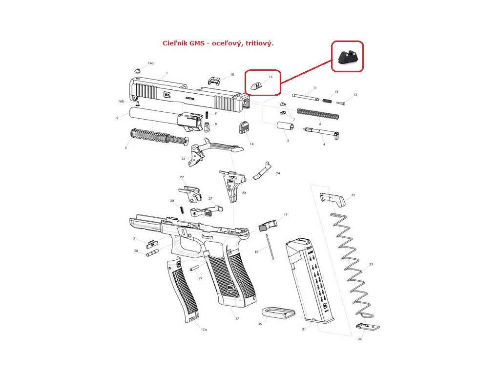 Oceľový cieľnik Glock GMS Black - bez bodu, s výškou 11,5mm. Obrázok rozkresu zbrane je ilustračný, slúži pre zobrazenie kde v zbrani sa daná súčiastka nachádza.