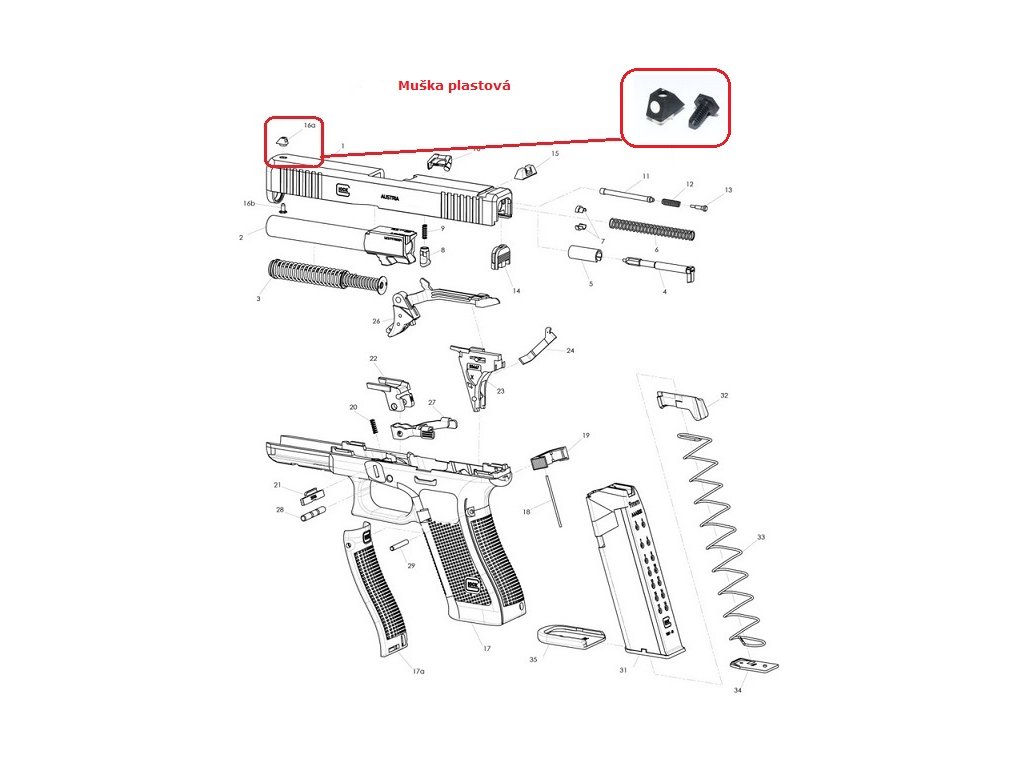 - Muška vhodná pre všetky modely a generácie pištole Glock.
