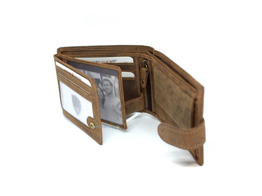 Pánska peňaženka z hovädzej kože s ochranou platobnej karty RFID, množstvom priehradiek, mincovníkom a zapínaním na cvok.