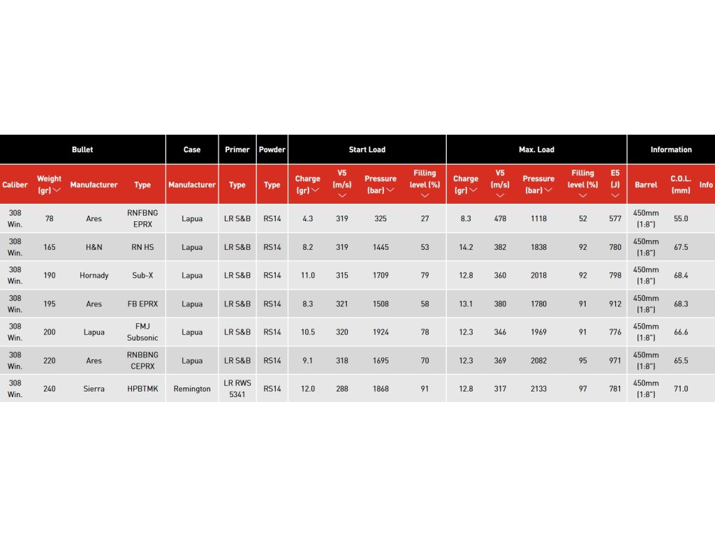 Neposkytujeme nabíjacie hmotnosti. Používaj výlučne oficiálne datasheety alebo overené manuály pri zostavovaní munície. Nevhodné zaobchádzanie môže viesť k vážnemu zraneniu alebo poškodeniu zbrane.