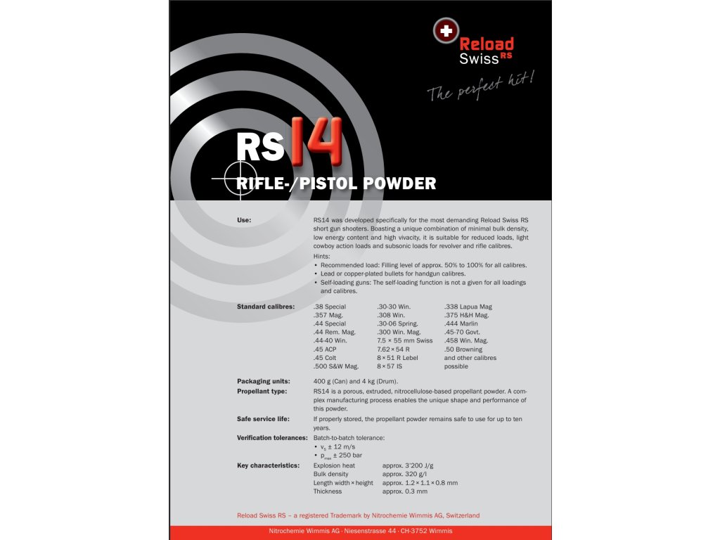 Reload Swiss RS14 je moderný puško/pistolový prach, ktorý kombinuje minimálnu objemovú hustotu (low bulk density), nízky energetický obsah a vysokú vivacitu. V praxi to znamená, že sa veľmi dobre hodí na reduced loads a subsonické zostavy (vrátane ťažších projektillov v .308 Win), pretože umožňuje vysoké plnenie nábojníc bez rizika prekročenia tlakových limitov pri bežnom postupe. RS14 sa vyznačuje čistým spaľovaním, konzistenciou a relatívne jednoduchým doladením výslednej rýchlosti V0 v subsonickom pásme.