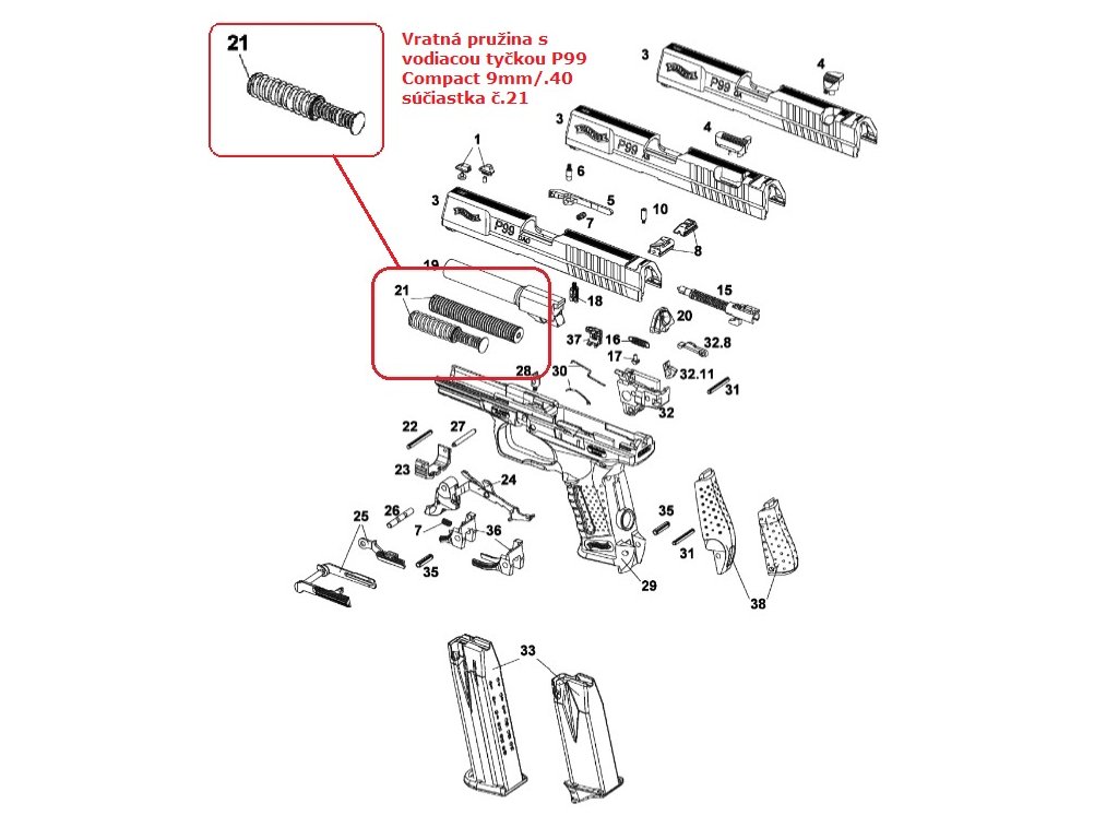 Komplet - vratná pružina s vodiacou tyčkou pre pištoľ Walther P99 Compact kalibru 9mm, .40SW.