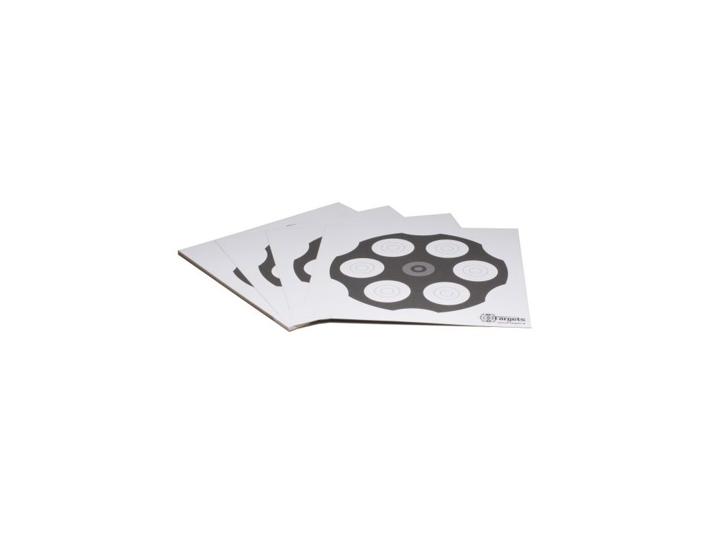Papierový terč s motívom valca revolvera. Terč má 6 menších terčíkov v nábojových komorách revolverového valca.